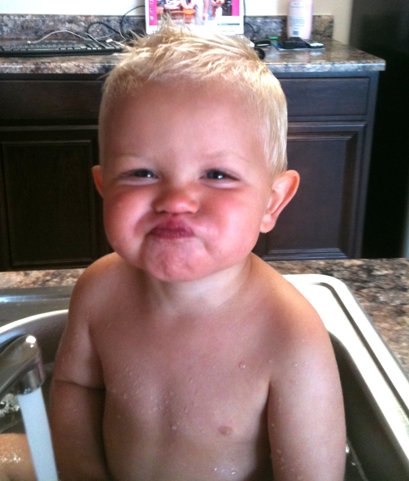Loves getting in the sink and playing with a cup. This is what he does while I clean the kitchen...is that weird??? Oh, love this face by the way...